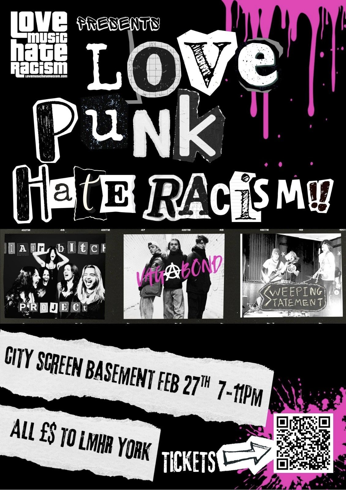 We are utilising the power of music by putting on gigs to raise awareness and support. Our first gig is at the Basement at City Screen on Friday 27th February and it is sold out! It has been badged as Love Punk Hate racism!