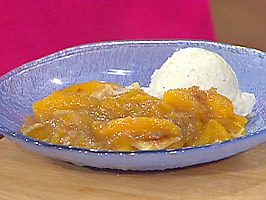 Spray a 10-inch square pan with canola oil and place 1 layer of dough into the baking dish. Place a few chips of butter, as well as a dusting of the remaining sugar, on the bottom crust. Pour the peach mixture into the baking dish. Cut the top layer of dough into strips and arrange them on the top of the peaches in a lattice pattern. Top with 3 or 4 chips of butter and bake for 25 to 30 minutes or until the crust is brown and the peaches are bubbling. Serve warm with vanilla ice cream.