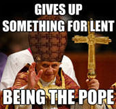 So the big news for the year so far would seem to be that the Pope is retiring. It’s only a surprise because it hasn’t happened in nearly 600 years, but frankly isn’t he a bit of an old duffer to be holding such a big role? I mean he was 78 when he took the job on in 2005. I wonder why he chose to go now and did he pontificate much (did you see what I did there)? But clearly the world economy must be in a bad state when even God starts laying people off. Anyway if you are likely to be offended by an opinion of religion which may not be in support of the Pope or the Catholic Church I suggest you stop reading now. You have been warned!