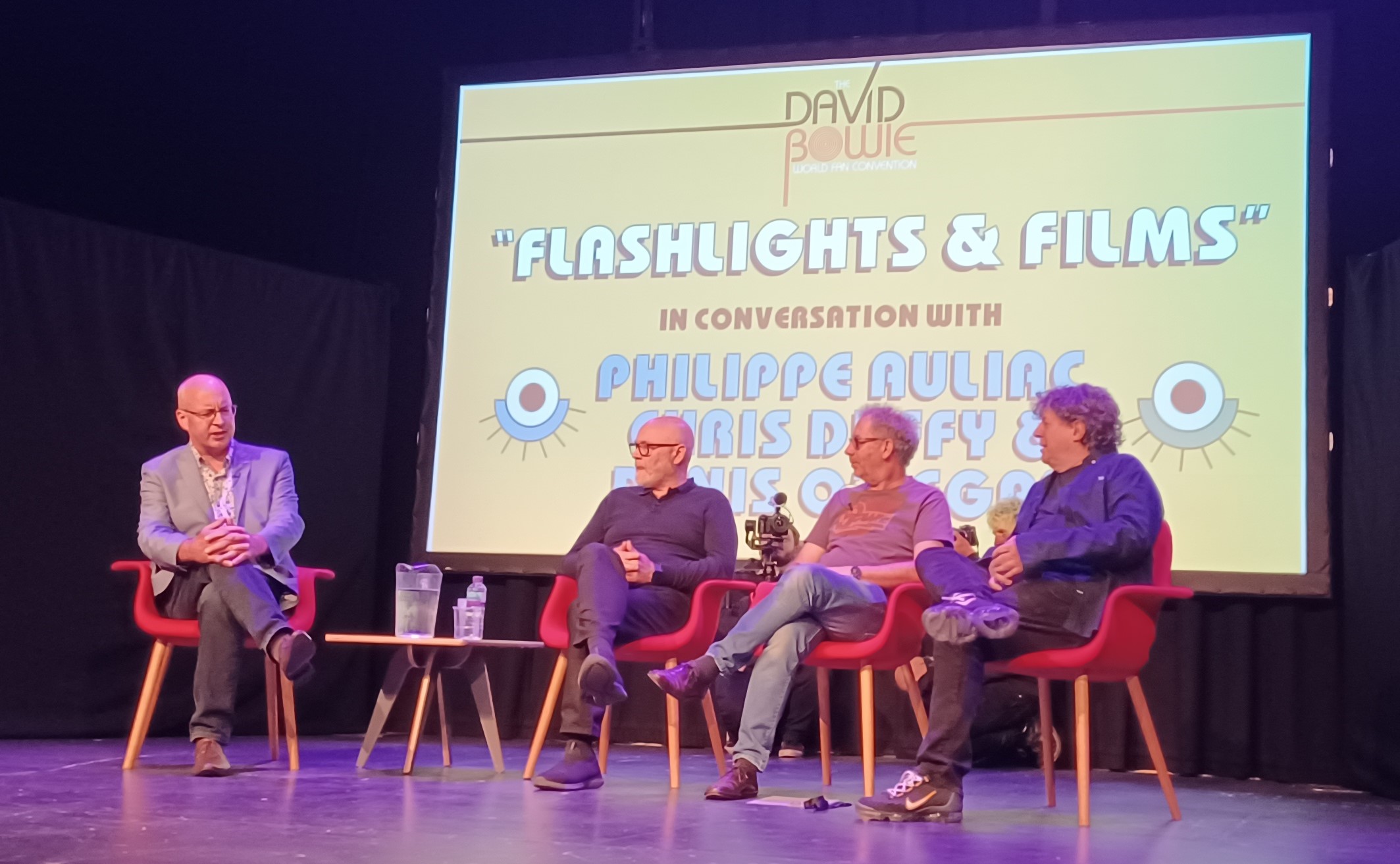 First up were a couple of very interesting and informative short films presented by the curators of the David Bowie Is exhibition, Victoria Broackes, and Geoffrey Marsh. This was followed by Jonathan Barnbrook a supremely talented designer who created the cover for Bowie’s final two albums and Heathen to name just a few. Not only is he a great designer he is also a confident and eloquent raconteur. His sense of humour is magnificent and frankly right up my street! After that Kevin Cann was back to facilitate a conversation with the owner and creator of the Duffy Archive, Chris Duffy. Chris is a talented photographer in his own right and his father was the person behind the iconic ‘Aladdin Sane’ album. Chris talked about his childhood, his father, Bowie, and many of the artists he has photographed. Very entertaining indeed! Chris returned for the next session in which Nicholas Pegg was in conversation with Mr. Duffy, Phillipe Auliac, and Denis O’Regan. It was pleasing to hear Phillipe say that it was him who shot Bowie not doing a Nazi salute at Victoria Station in 1976. I was there and there most definitely was not a nazi salute. The press turned a snapshot into a vile slur. O’Regan’s memories were enlightening, especially his story about the on-stage feuds between Mick and Keef. The final session was Nicholas Pegg in conversation with the obscenely talented Donny McCaslin. Donny went into great depths about the creation of ‘Black Star’ and the ‘No Plan’ EP. We learned that while Donny is a master of many instruments, the piccolo is not one of them. Donny shared some demos of his new project which is performing ‘Black Star’ and other Bowie songs with a full concert orchestra. The plan is for it to be performed for the first time in the US in September. Even the demos sounded magical, they made the hairs on the back of my neck stand on end and I was washed with wonderfully warm emotions. Donny closed his session with a solo sax performance of, I think, “Warszawa”. Every session has been incredibly good, (apart from the NFT presentation on Friday), but I think Donny’s just about shaded it for me as the best of the whole weekend. Before we left we were treated to seeing all the remaining guests appear on stage as a final thank you.