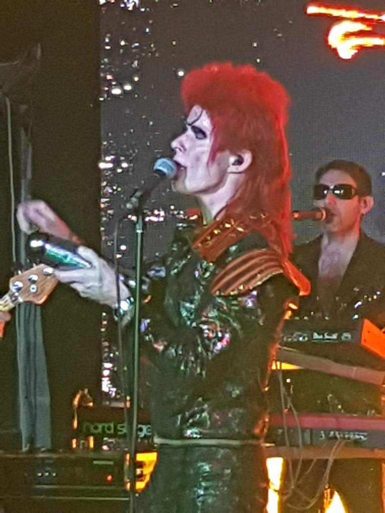 After a brief interval the band returned in full Serious Moonlight mode and smashed 80s Bowie with rousing and authentic early 80s anthems; “Let’s Dance”, “Ashes To Ashes” and “China Girl”. The 80s was never my favourite David Bowie period, but it is impossible to deny that some of the songs are guaranteed party starters and the audience agreed and threw themselves into singing and dancing with gargantuan glee and amazing abandon. I am sure there were plenty of sore throats and aching muscles the next day. John O’Neill left the stage as 80s Bowie while the stupendously talented band carried on before he returned as a 90s Bowie and wowed us with “Hallo Spaceboy” and what you might call a deep cut, “Look Back In Anger” from the 1979 David Bowie album ‘Lodger’. I was intrigued about what the encore might be after the band left the stage. I was blown away. They kicked off the final three songs with a note perfect recreation of “Black Star”, a song that the real Bowie never got to perform live. O’Neill looked the part wearing the bandage style mask with those eerie black dot eyes. Taking on that song was for me one hell of a brave move, but it paid off, it was excellent and beautifully performed. How could Absolute Bowie follow such a mountainous peak? Quite spectacularly actually. Firstly with another outing for the 12 string on “Space Oddity” and a very passionate and moving “Heroes”.