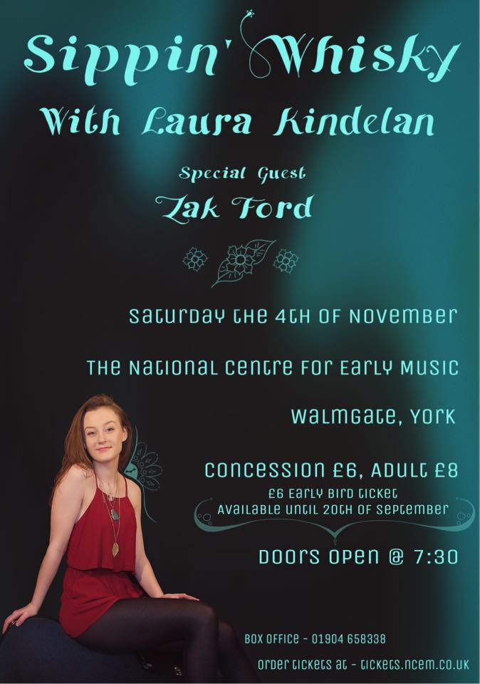 I first saw Laura Kindelan back in July when she was part of the bill supporting Billie Marten at the Basement in York. She was an absolutely delightful and talented performer back then which made me really keen to see her play again. This showcase gig at the beautiful venue that is York’s Centre For Early Music was to promote “Sippin’ Whisky” which is her newest release. Was she as good this time as she was in the summer? You will have to read on to find that out. Zak Ford was tonight’s support act, this young man is a little folky, a little soulful and he has written some excellent songs based on tonight’s evidence. Notably “Honest Man” and “My Body”. My only criticism is that at times his enunciation could have been clearer. But that aside it was a very good set of songs and a heartfelt performance.