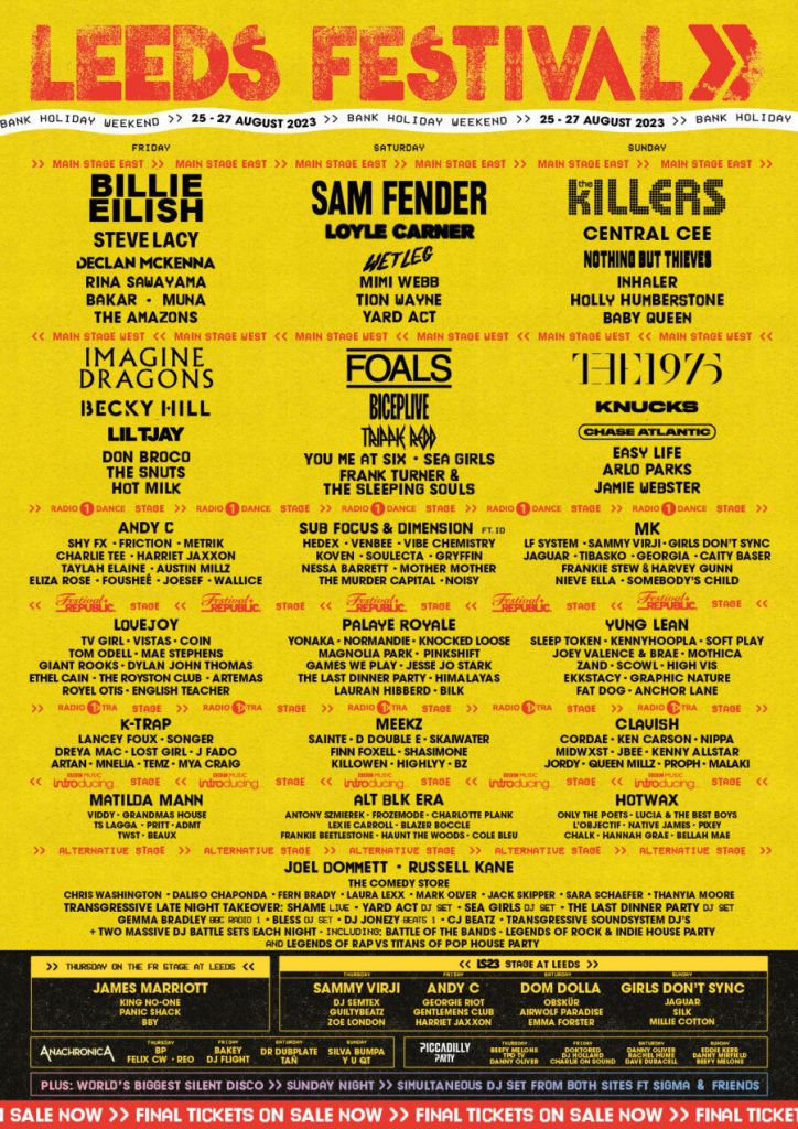 Let’s start with the Friday lineup for this year’s Leeds Festival. Firstly though, we have now come to expect this joint headline thing for Leeds/ Reading each day of the festival. I don’t see the point, are the punters getting more value for money? That is debatable, but maybe, but not a great deal. Surely the last act to play on that particular night is the main headliner, right? Anyway, enough of the mini-rant. The Main Stage East headliner on Friday 25th August is the towering talent, Billie Eilish. Earlier in the evening Rina Sawayama will undoubtedly put on a stunning set. Also, keep an eye out for the Amazons, they come highly recommended by my daughter. Main Stage West on the Friday looks a little “safe” to me with Becky Hill followed by Imagine Dragons. However, to balance that we will be given a stonking double whammy of the magnificent Don Broco followed by the rather awesome Snuts!