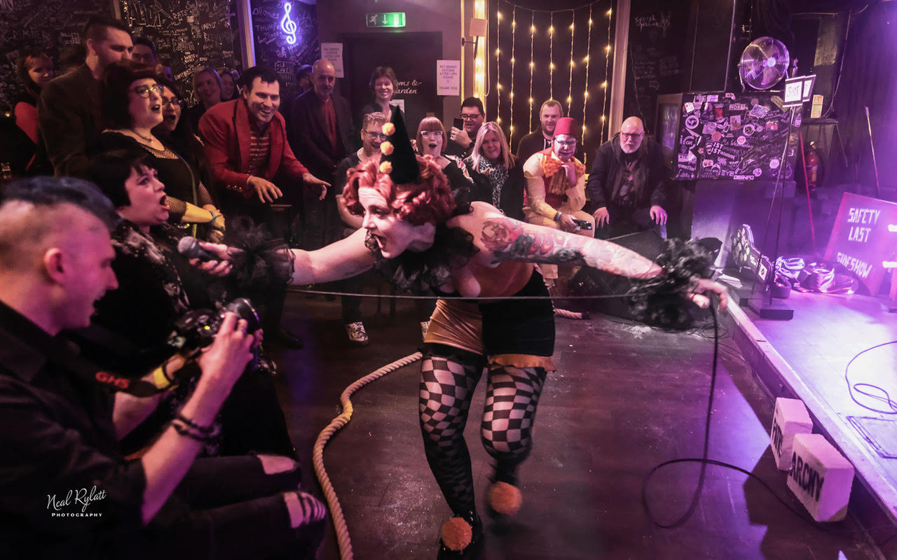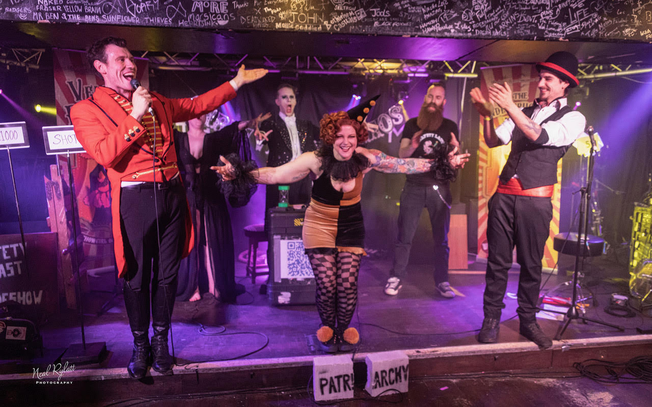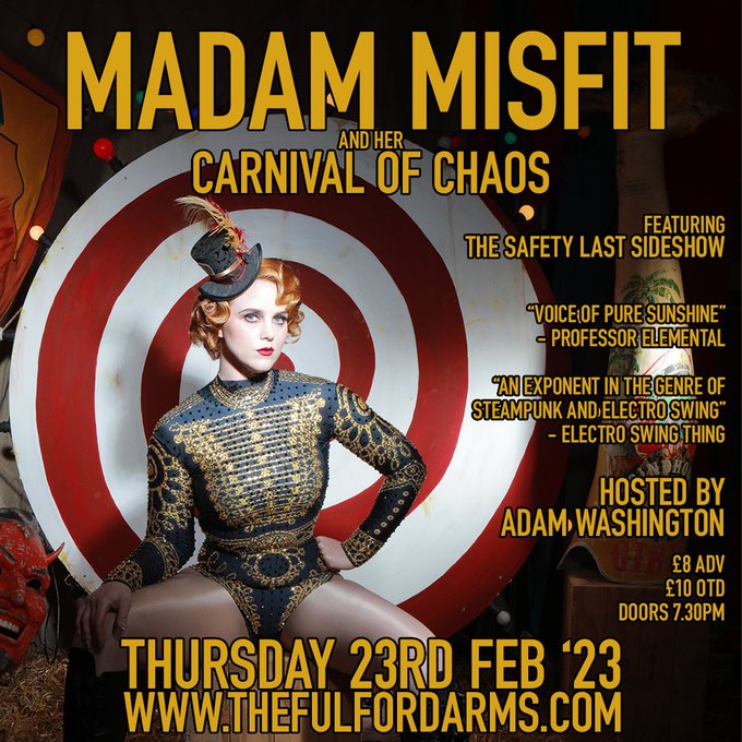 I have seen many gigs at one of York’s finest venues, the Fulford Arms, but never have I experienced anything close to Madam Misfit and her Carnival of Chaos. David Bowie once sang the line “turn and face the strange” and that night we certainly did face the strange. This show wouldn’t have been out of place in one of the weirder episodes of American Horror Story, notably ‘Freak Show’ (series 4 from 2014). It wasn’t just a gig, although Madam Misfit did perform a few tunes, it was more like a travelling carnival sideshow from the US midwest in the 30s. There are a number of different types of carnival sideshows in the USA, one of those is the Ten-in-One which would offer a program of ten sequential acts under one tent for a single admission price. It might include a freak show, but would definitely include “working acts”, Madam Misfits carnival was most definitely built on those working acts. The master of ceremonies was Adam Washington, sporting a red frock coat suit and knee boots to appear just like the finest ringmaster you could imagine, a top hat would have made the outfit perfect. Adam kicked off proceedings with a rendition of “Pure Imagination” from ‘Willy Wonka and the Chocolate Factory’, it was a performance that was fit for a London Theatre Stage. He introduced a fine magical, medley of madness delivered by the campest magician in the world, Magic Adam, juggler extraordinaire Ed Mondo, daring, dangerous, and dynamic duo the Safety Last Side Show, and of course the Empress of Chaos herself, Madam Misfit.