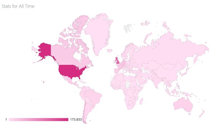 Incidentally there are a handful of countries that have never visited With Just A Hint Of Mayhem, well at least not yet. If you can make it happen for Svalbard, Western Sahara, Bujumbura, Chad, Turkmenistan, Kosovo, Djibouti and unsurprisingly, North Korea. There are also thirteen countries with only one view each in 10 years.